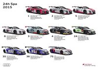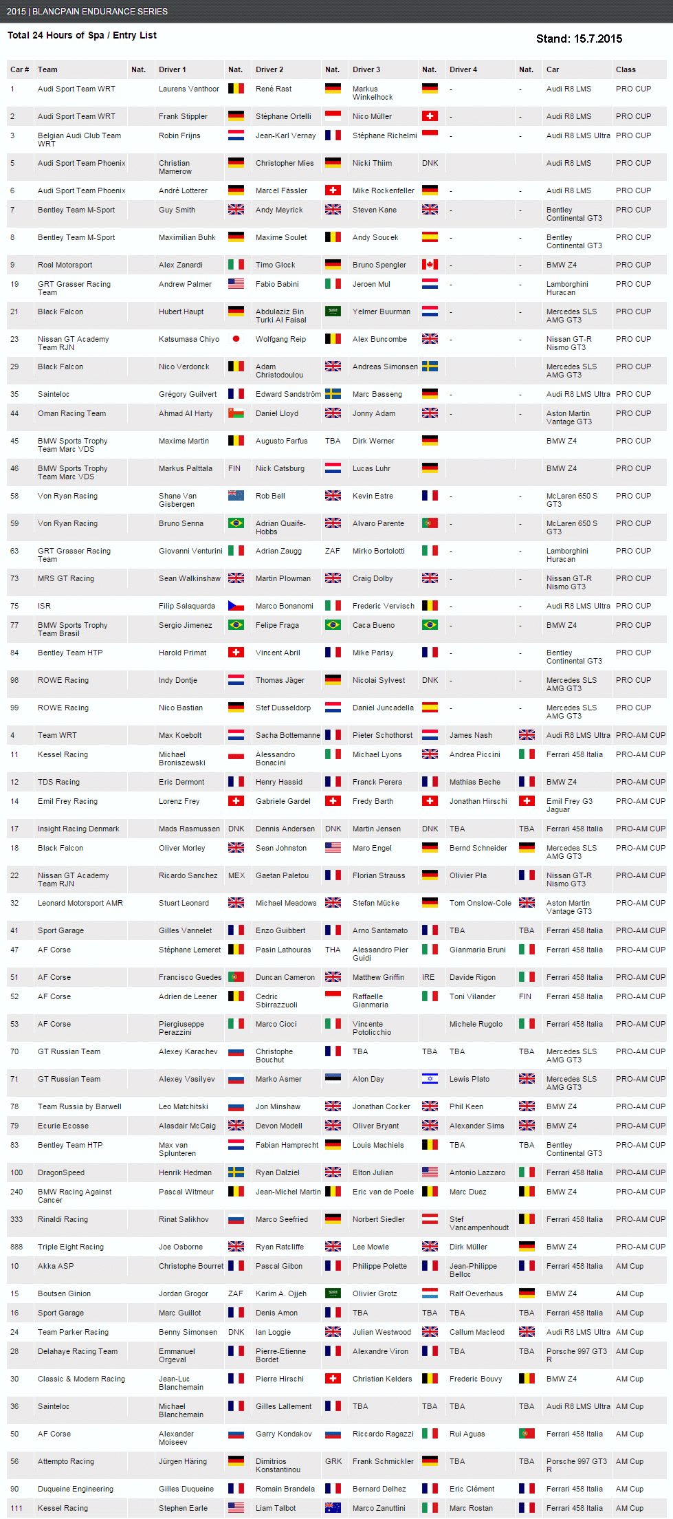 Gemeldet sind 19 Teams, u.a. 7 Audi R8 LMS ultra, 2 BMW Z4, 2 McLaren 650 S, 2 mercedes SLS AMG, 2 Bentley und je ein Nissan, ein Gallardo LP560, ein Ferrari 458 Italia und ein Porsche 997 R.