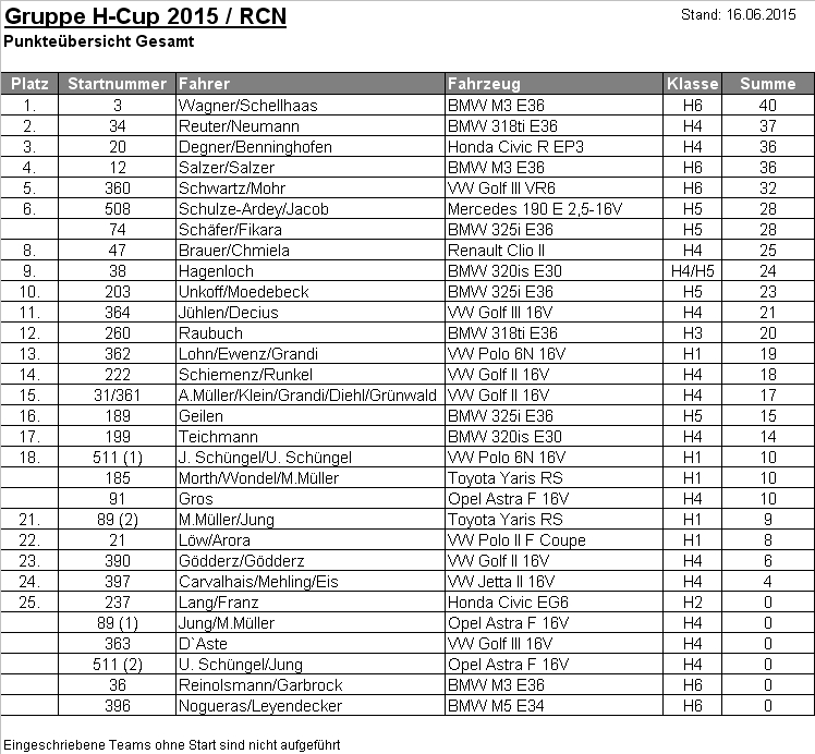 Info von Frank Thönissen: Tabellenstand nach dem 6. Lauf zum Gruppe-H-Cup 2015.