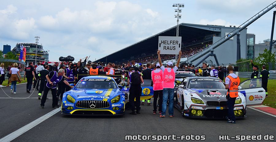 Beide Autos hatten einen guten Start in das 24h-Rennen am Samstagnachmittag und konnten von Beginn an Plätze gut machen. In der fünften Runde wurde das Rennen unterbrochen, da ein heftiges Unwetter die Nordschleife mit Regen und Hagel kurzzeitig lahmlegte. Um 19:00 Uhr erfolgte der Re-start und von da an arbeiteten sich die AMG-Team HTP Motorsport-Piloten immer weiter nach vorne an die Spitze.