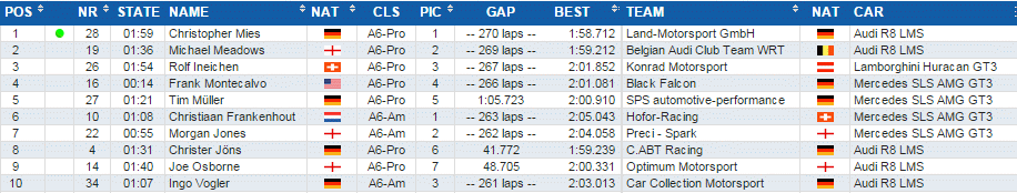 | A6 | 34 | Car Collection Motorsport / Germany | Audi R8 LMS (5200cc) | Johannes Dr. Kirchhoff / Gustav Edelhoff / Max Edelhoff / Elmar Grimm / Ingo Vogler |