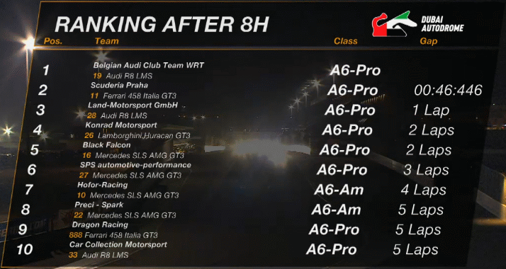 | A6 | 5 | Belgian Audi Club WRT / Belgium | Audi R8 LMS (5200cc) | Mohammed Bin Saud Al Saud / Mohammed Bin Faisal Al Saud / Marcel Fässler / Michael Vergers |