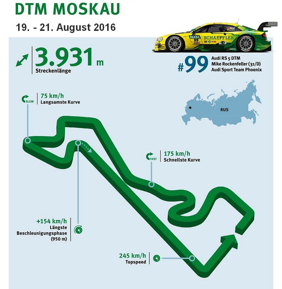 Zwei Wochen später müssen in Nürnberg alle Umbauten beendet sein. Auf dem temporären Stadtkurs, dem Norisring, steht zwischen dem 30. Juni und 2. Juli der Höhepunkt der Saison an. Noch vor der Sommerpause steht die weiteste Reise des Jahres an: vom 21. bis zum 23. Juli findet auf dem Moscow Raceway in Russland das fünfte Rennwochenende statt.