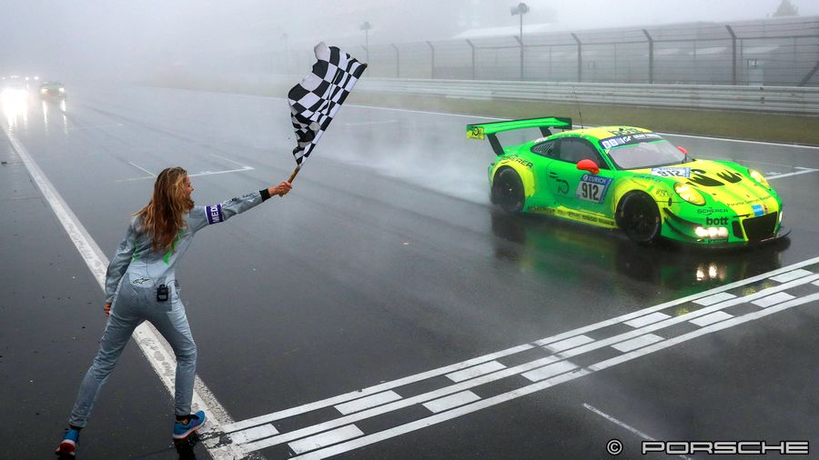 Der Porsche 911 GT3 R mit der Startnummer 912 hat nach einer spannenden Schlussphase den 24-Stunden-Marathon in der Eifel gewonnen. Der Neunelfer vom Team Manthey-Racing setzte sich 70 Minuten vor dem Rennende bei strömendem Regen an die Spitze des Feldes und gab diese Führung nicht mehr ab. Damit verbuchte Porsche beim legendären Langstreckenklassiker den ersten Sieg seit 2011 und feierte insgesamt den zwölften Erfolg.