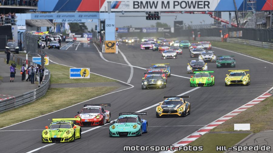 Bei bestem Wetter wurde das 24-Stundenrennen pünktlich um 15:30 Uhr gestartet und die drei Porsche 911 GT3 R von Manthey, Falken und Frikadelli führten die GT3-Meute an.