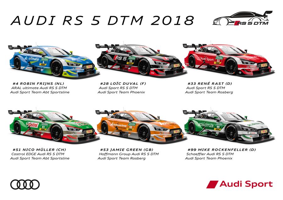 Der restliche DTM-Fahrerkader von Audi bleibt wie im Vorjahr: Loïc Duval (F), Jamie Green (GB), Nico Müller (CH), René Rast (D) und Mike Rockenfeller (D) hat der Automobilhersteller als Piloten bestätigt. Mit diesem Team gewann Audi in der Saison 2017 alle drei Titel (Fahrer, Hersteller und Teams).