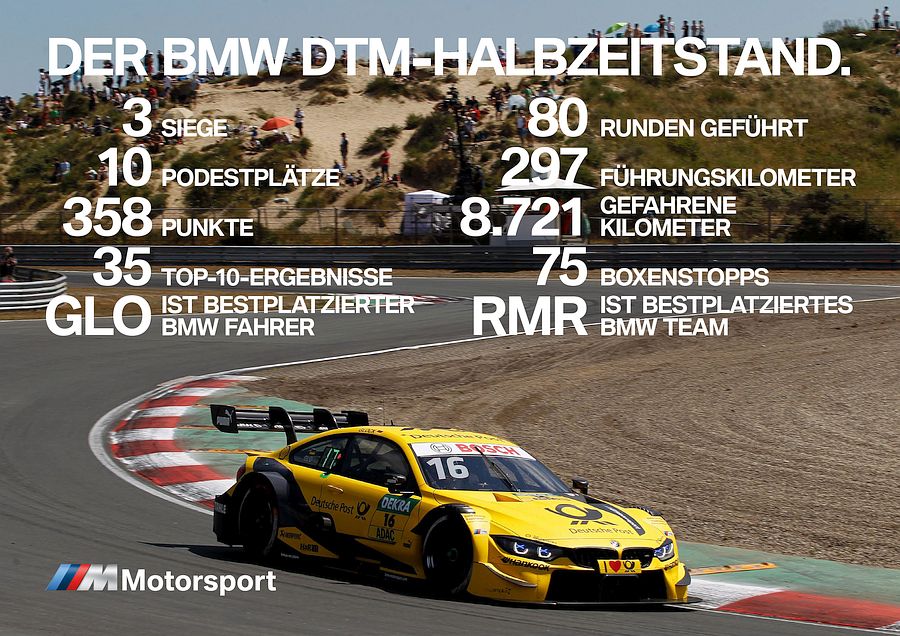 Das Sonntagsrennen in Zandvoort (NED) markierte zugleich das Ende der ersten Hälfte der DTM-Saison 2018. Die sechs BMW Piloten konnten von den ersten zehn Läufen des Jahres drei gewinnen und errangen zehn Podestplätze. Insgesamt stehen 358 Punkte und 35 Top-10-Ergebnisse zu Buche. Zusammen legten die Fahrer 8.721 Rennkilometer zurück, 297 davon an der Spitze des Feldes. Die beiden BMW Teams absolvierten 75 Boxenstopps.