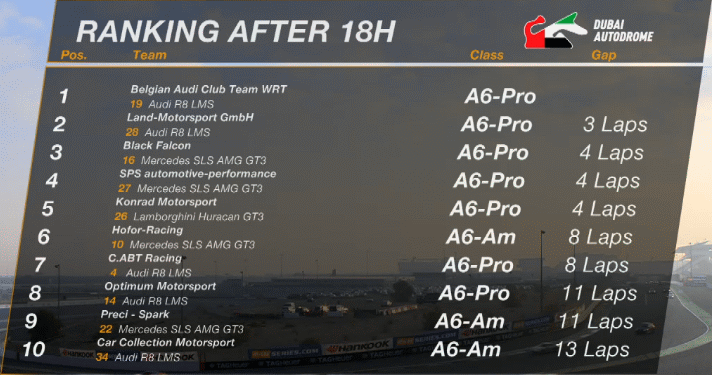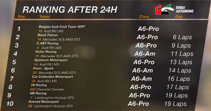 | A6 | 5 | Belgian Audi Club WRT / Belgium | Audi R8 LMS (5200cc) | Mohammed Bin Saud Al Saud / Mohammed Bin Faisal Al Saud / Marcel Fässler / Michael Vergers |