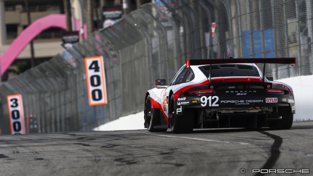 In den ersten Rennstunden auf dem aus zwei schnellen Steilkurven und einem engen Infield bestehenden Traditionskurs verloren die 510 PS starken und bei Porsche Motorsport in Weissach völlig neu entwickelten 911 RSR durch insgesamt sechs unplanmäßige Reifenwechsel immer wieder Zeit und Positionen. Doch nachdem das Problem mit den rechten Vorderreifen durch eine weitere Setup-Optimierung gelöst werden konnte, fanden beide 911 RSR immer besser in ihren Rhythmus. Als einsetzender Regen für noch schwierigere Bedingungen sorgte, kämpften sie sich an die Spitze der stark besetzten Klasse GTLM und absolvierten im Wechsel viele Führungsrunden auf dem 5,729 Kilometer langen Speedway. Die Sportwagenfans, die sich auch vom schlechten Wetters nicht den Spaß verderben ließen, erlebten über den gesamten Rennverlauf atemberaubende Positionskämpfe und immer wieder neue Spitzenreiter.