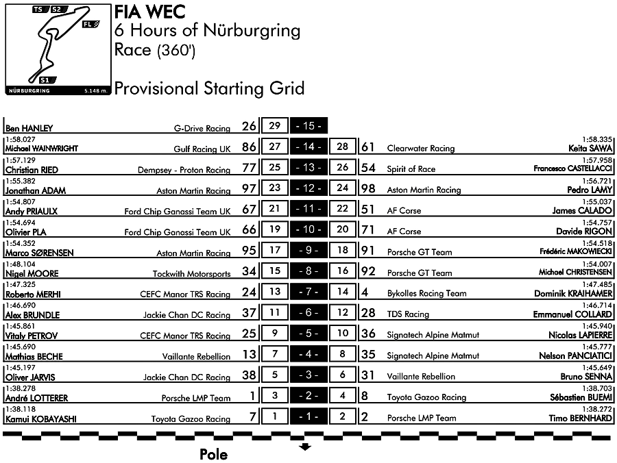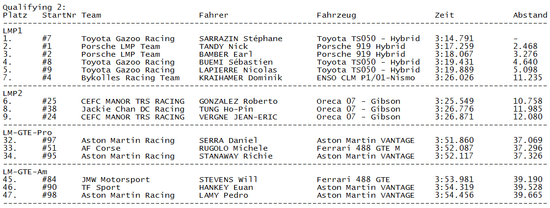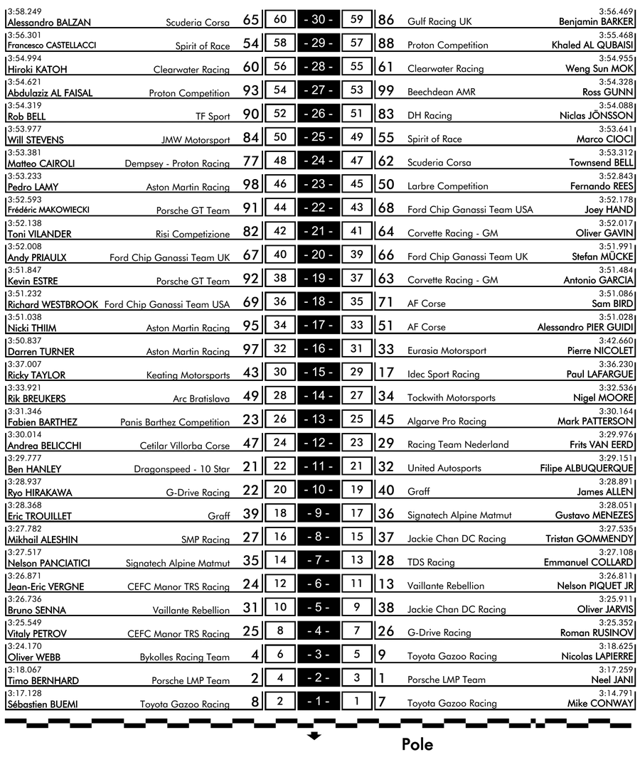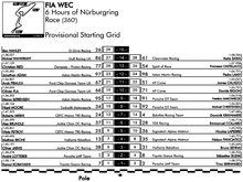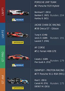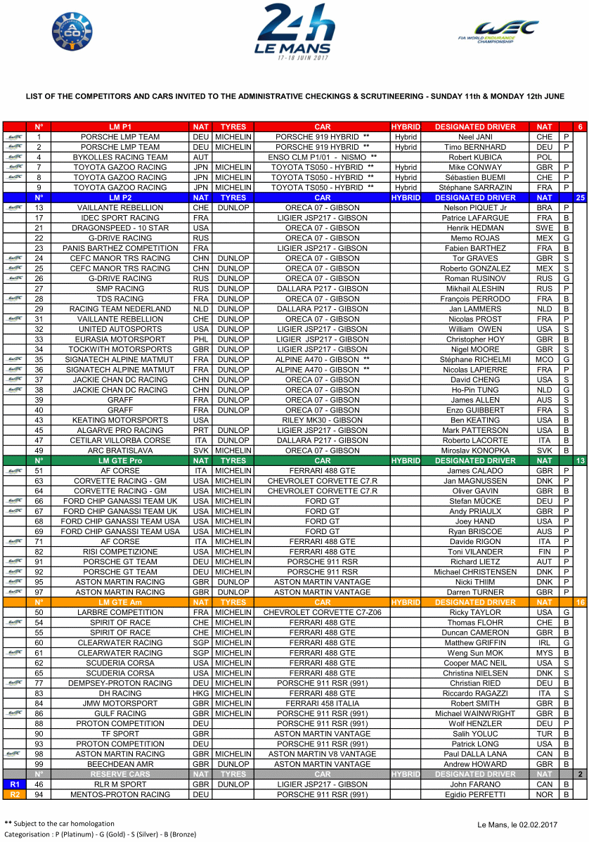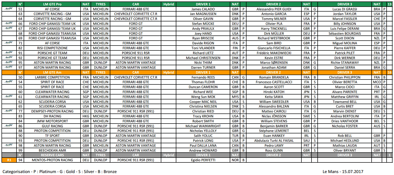 Hier sind alle 60 Plätze belegt - als Überraschung wird Toyota mit 3 LMP1 Hybrid-Fahrzeugen am Start sein. Insgesamt starten 6 Fahrzeuge bei den LMP1. Die LMP2-Klasse ist die stärkste Klasse mit 25 Bewerbern. Die LM GTE Pro-Klasse besteht aus 13 Fahrzeugen, die GTE AM mit 16. Zwei Reserve Teams sind gelistet.