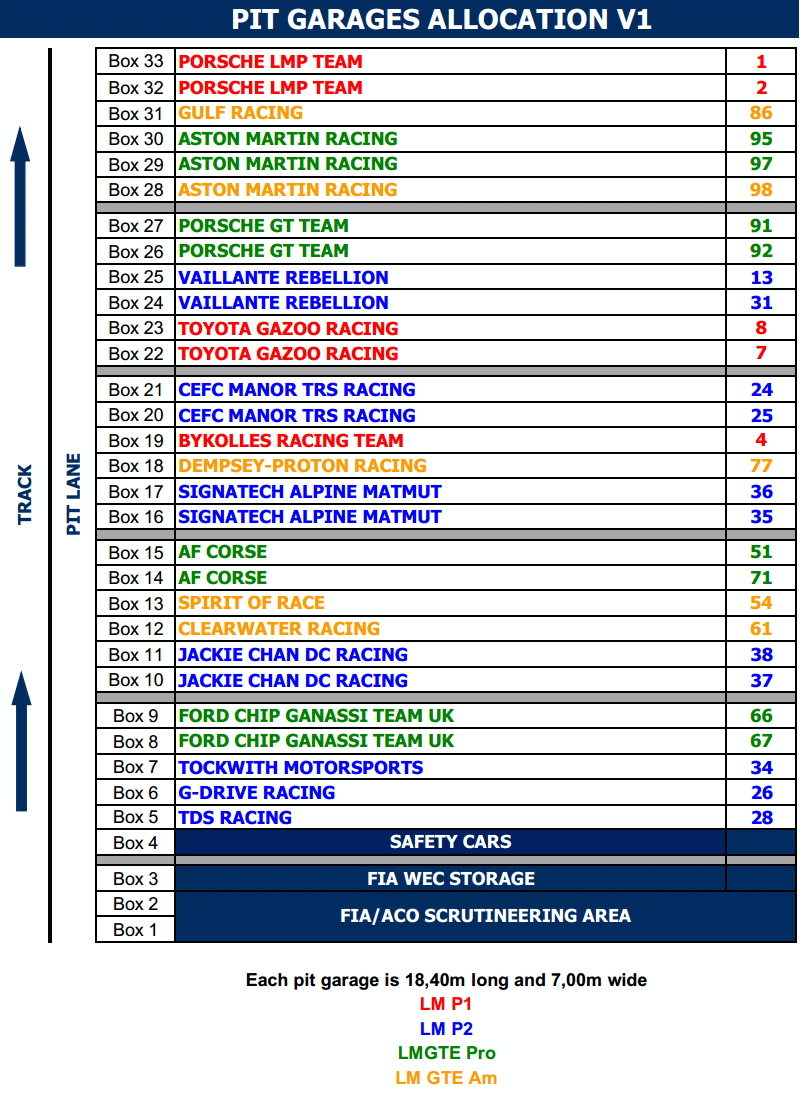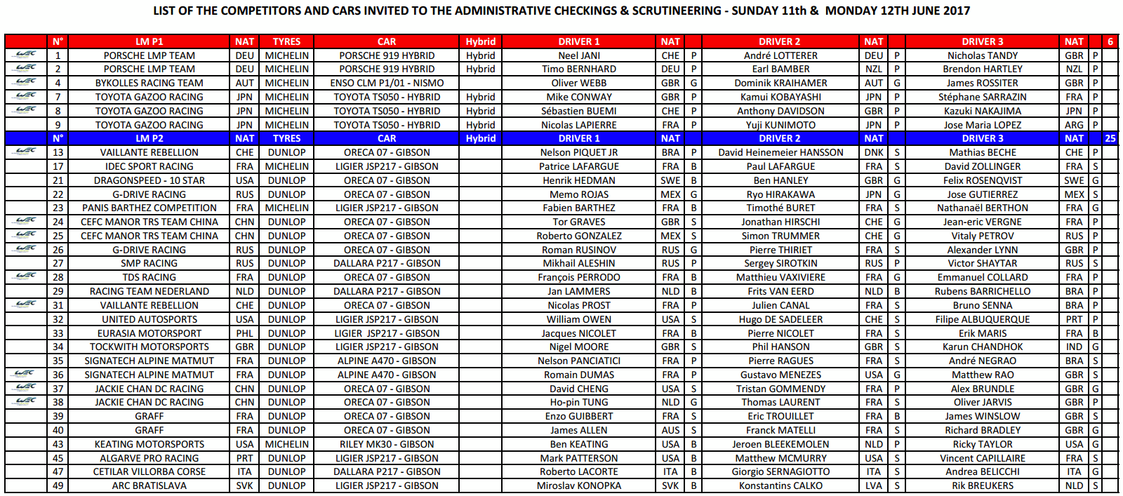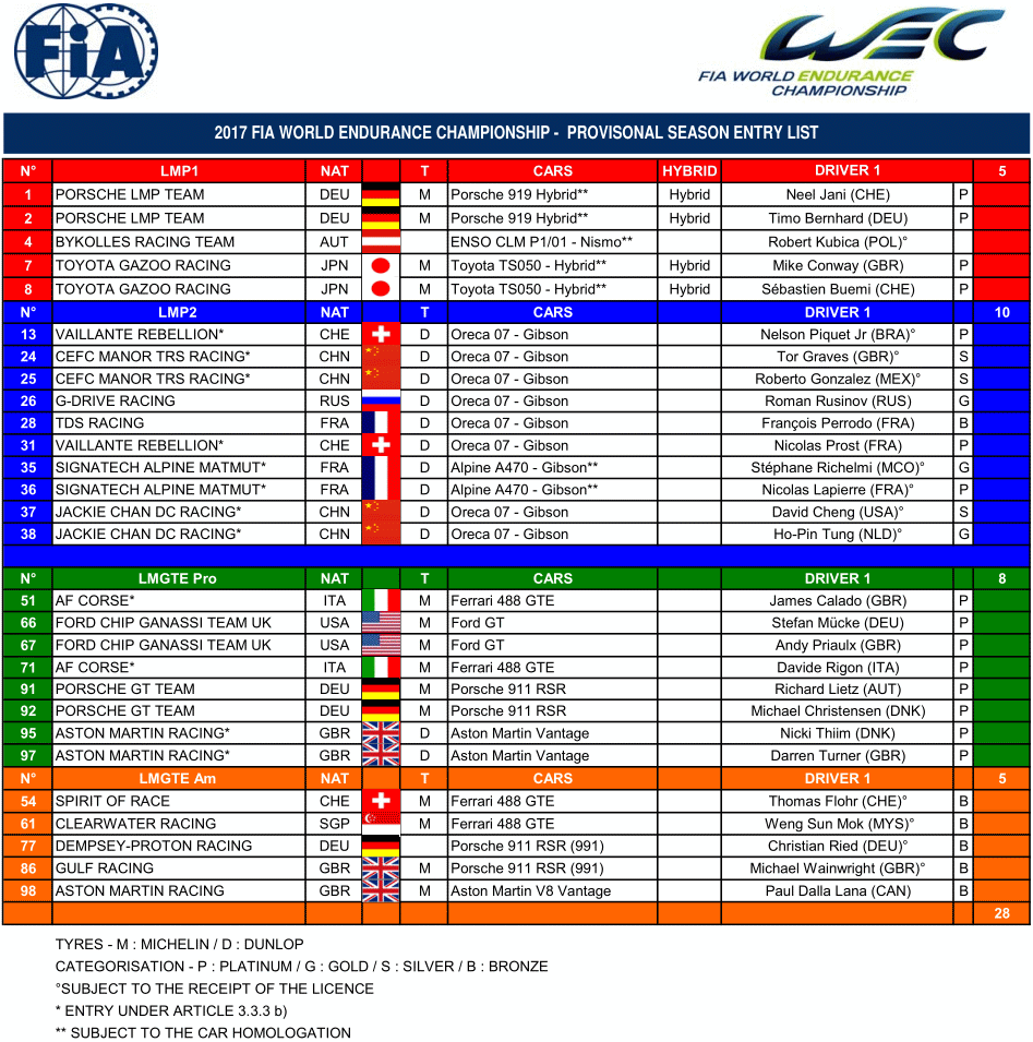 In diesem Jahr ist es eine sehr übersichtliche Liste der Teams und Fahrzeuge incl. dem Fahrer Nr. 1 geworden. Es wurden nur insgesamt 28 Fahrzeuge zur Weltmeisterschaftsserie angemeldet. Am stärksten schrumpfte das LMP1 Feld, nämlich von 9 (in 2016) auf nun 5 Fahrzeuge.
