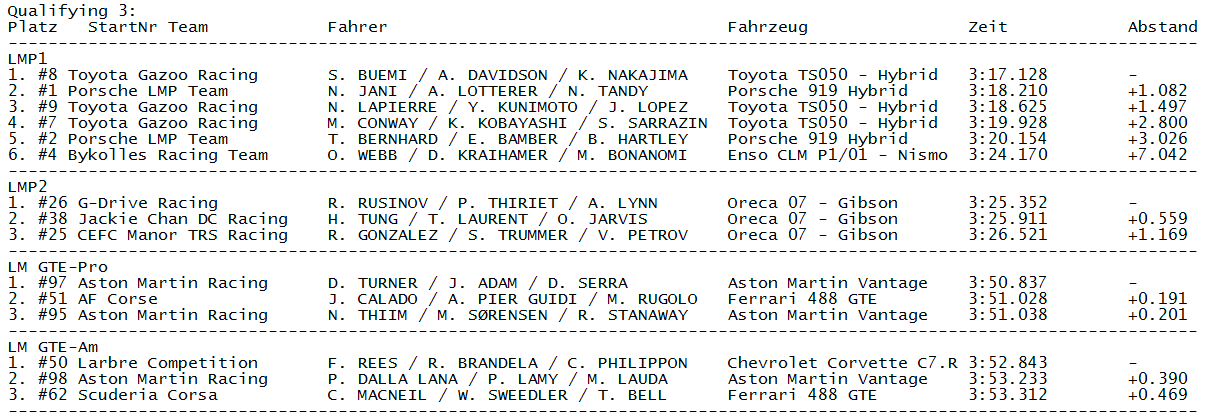 1. [# 7] TOYOTA GAZOO Racing (Mike Conway, Kamui Kobayashi, José María López) 1:42,832 Min.