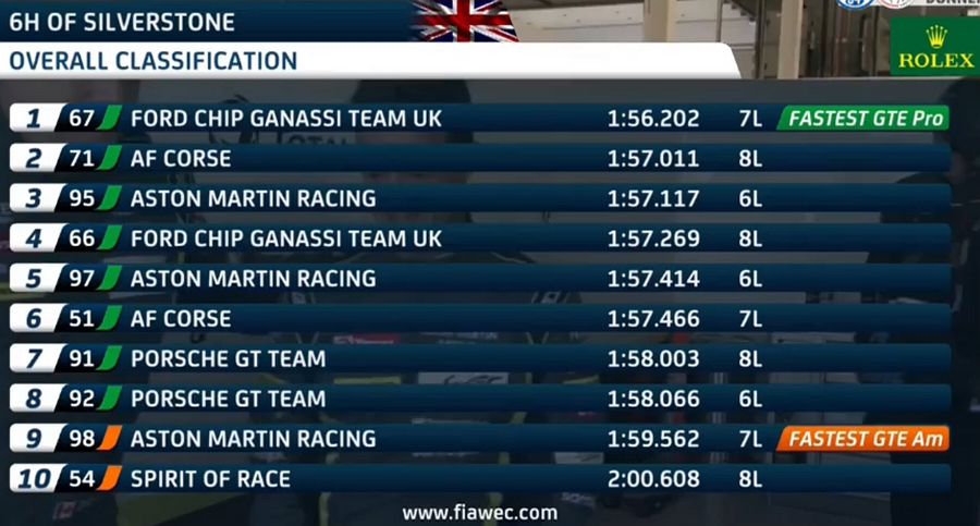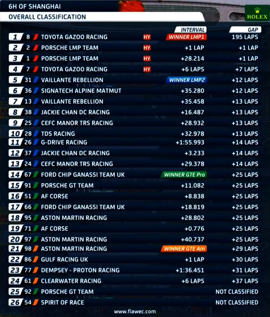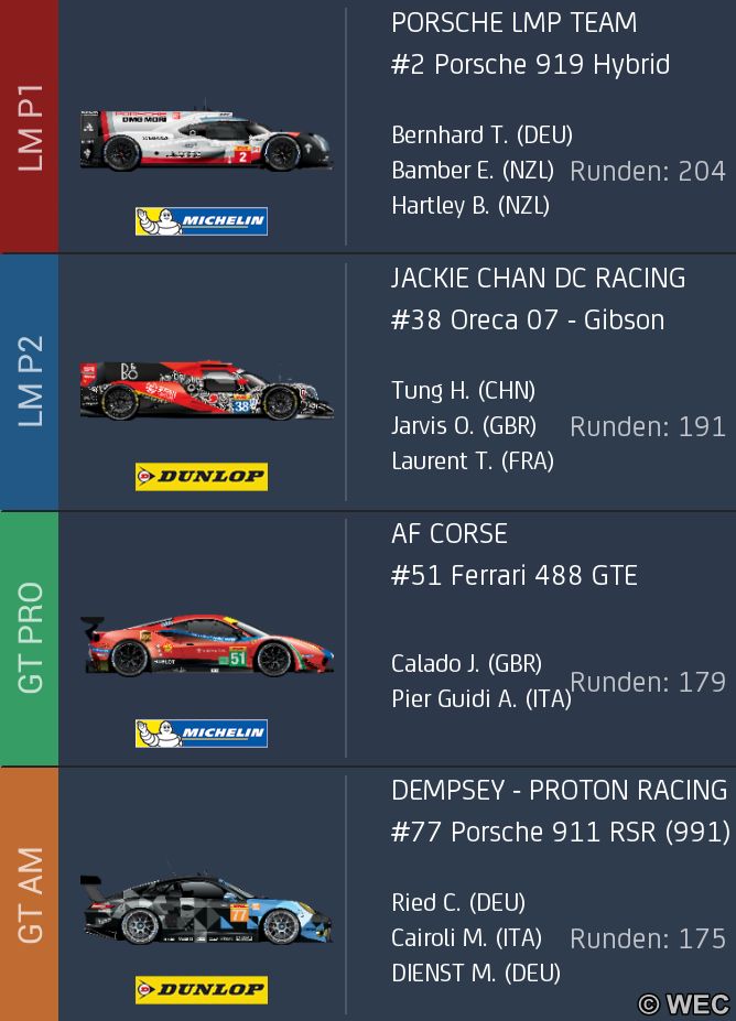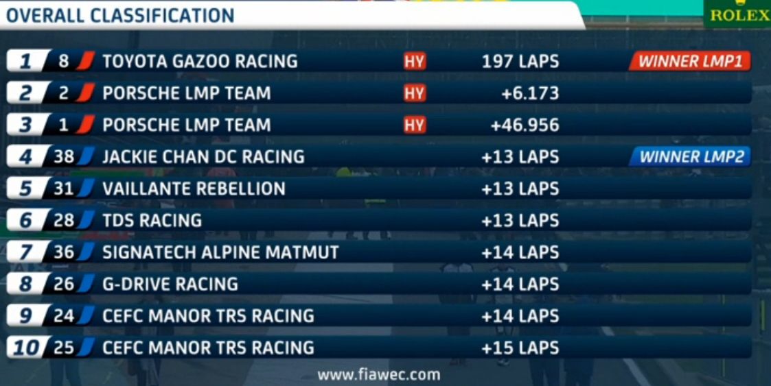 Mike Conway, Kamui Kobayashi und José María López komplettieren mit ihrem zweiten Platz im zweiten Toyota TS050 Hybrid das ausgezeichnete Ergebnis. Beide Trios haben unter den widrigen Bedingungen eine beeindruckende Performance gezeigt und sich weder von Regen und Nebel noch von den daraus resultierenden Safety-Car-Phasen ablenken lassen. Da die Sicht stetig schlechter wurde, musste das Rennen sogar vorzeitig abgebrochen werden. Trotzdem sicherte sich Toyota die volle Punktzahl.