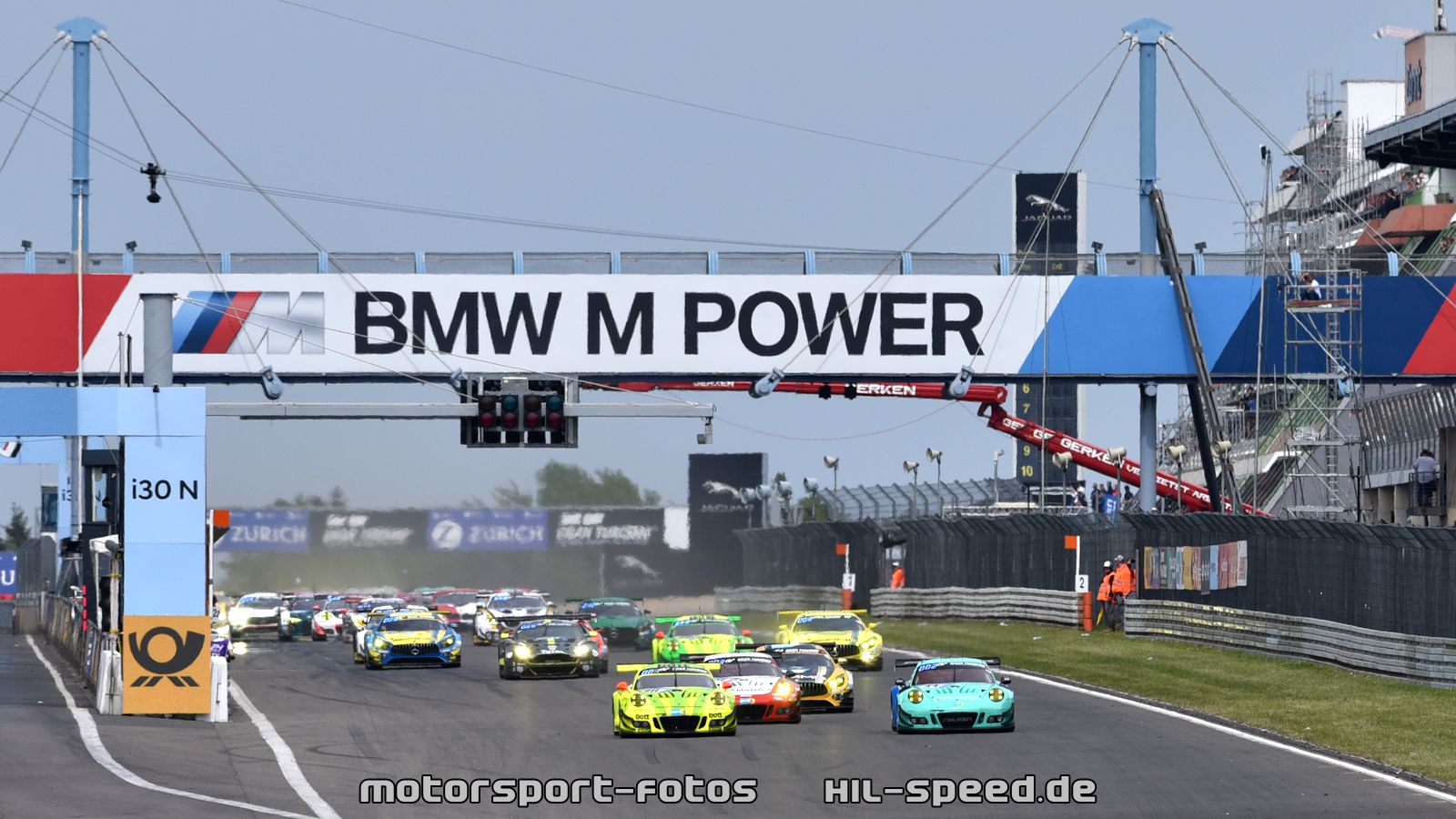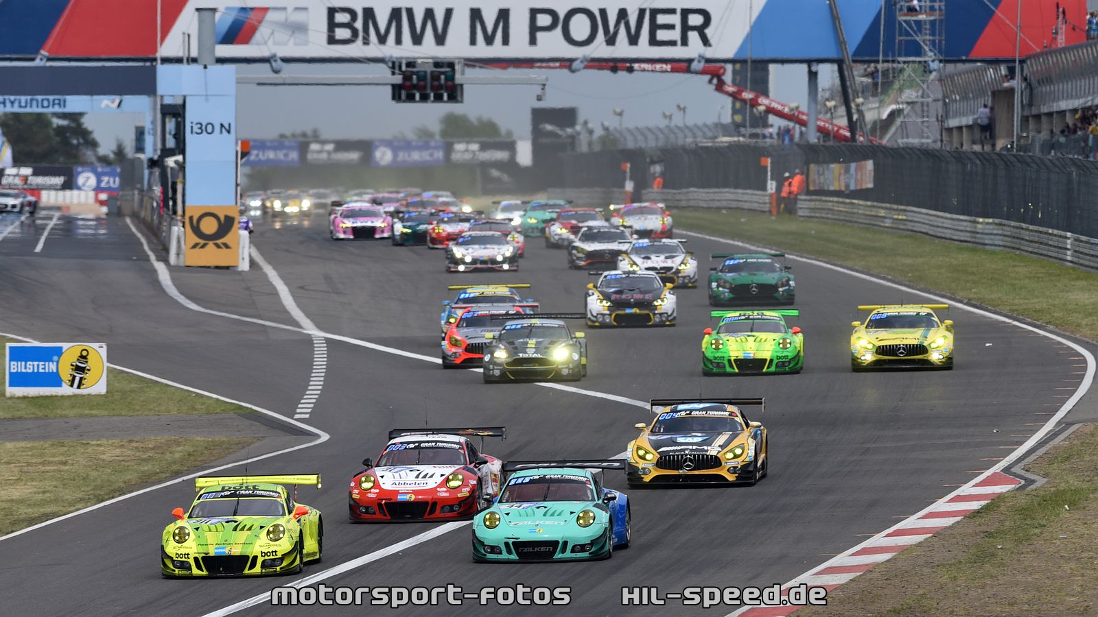 Bei bestem Wetter wurde das 24-Stundenrennen pünktlich um 15:30 Uhr gestartet und die drei Porsche 911 GT3 R von Manthey, Falken und Frikadelli führten die GT3-Meute an.
