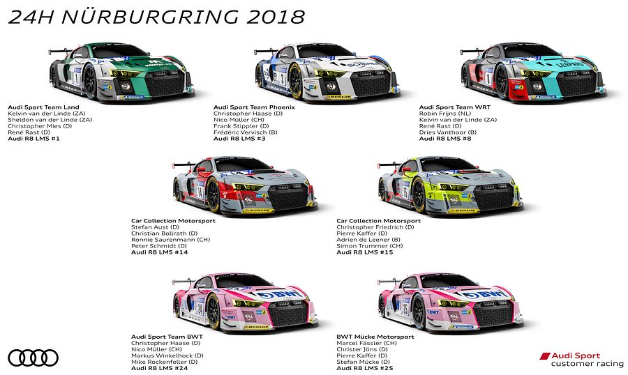 Allein von den 32 Spitzenfahrzeugen der GT3-Kategorie rollen 18 auf Rennpneus von Michelin. Hierzu zählt 2018 auch wieder der Audi R8 LMS der Vorjahressieger Christopher Mies (D) und Kelvin van der Linde (RSA). Im Audi Sport Team Land teilen sie sich den Mittelmotor-Rennwagen mit der Startnummer 1 mit dem amtierenden DTM-Champion René Rast (D) und Kelvins Bruder Sheldon van der Linde (RSA). Gemeinsam mit Rast ist Kelvin van der Linde auch auf dem Werks-R8 LMS des Audi Sport Teams WRT genannt. Hier heißen ihre Fahrerkollegen Robin Frijns (NL) und Dries Vanthoor (B). Als dritter R8 LMS rollt der Rennwagen von Audi Sport Team BWT auf Pneus aus Clermont-Ferrand. Am Steuer: Markus Winkelhock, Mike Rockenfeller, Christopher Haase (alle D) und Nico Müller (CH).