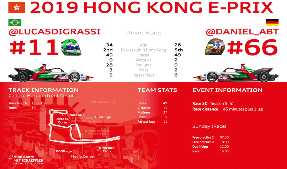 Vor dem elften von insgesamt 13 Rennen liegt di Grassi mit 96 Punkten auf dem zweiten Tabellenplatz, Teamkollege Daniel Abt folgt lediglich 29 Zähler dahinter auf Platz sieben. Für einen Sieg gibt es 25 Punkte, drei Zähler für die Pole-Position und einen Punkt für die schnellste gefahrene Rennrunde innerhalb der Top Ten. Neben dem Werksteam Audi Sport ABT Schaeffler ist auch das Kundenteam Envision Virgin Racing mit Sam Bird und Robin Frijns mit dem von Audi und Technologiepartner Schaeffler entwickelten e-tron FE05 unterwegs. Die britische Mannschaft liegt in der Teamwertung auf dem dritten Platz.
