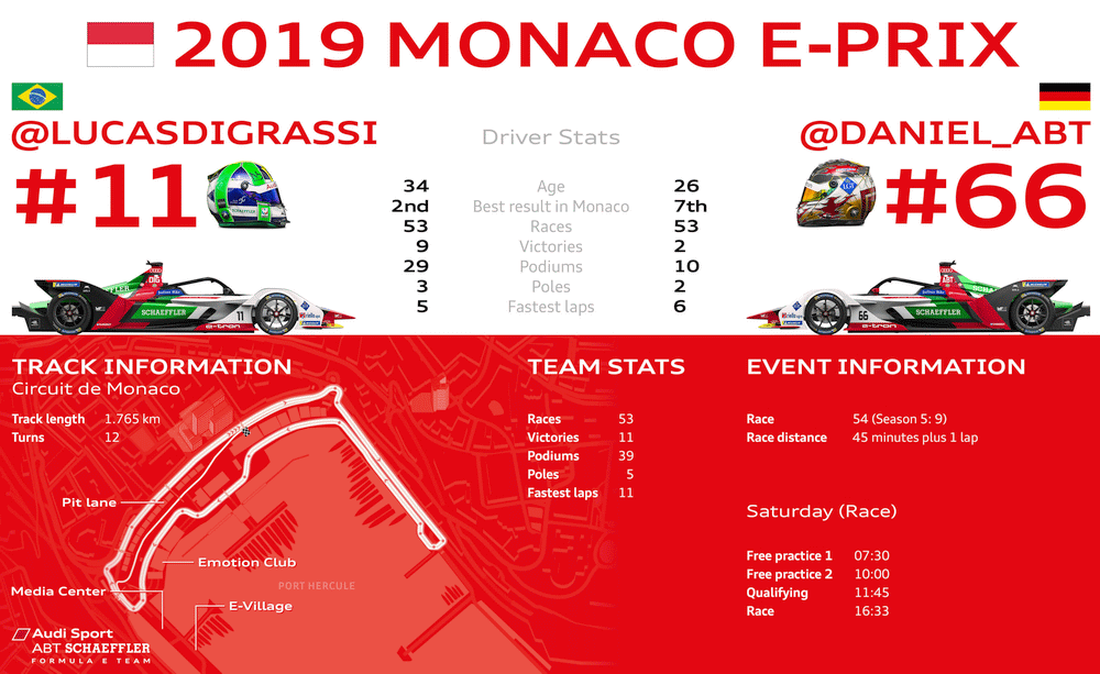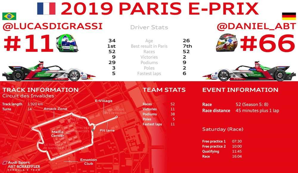 Nach dem umjubelten Heimsieg zuletzt in Berlin liegt Lucas di Grassi nur noch sechs Punkte hinter Titelverteidiger und Tabellenführer Jean-Éric Vergne. Nur diesen beiden Piloten ist es in der aktuellen Saison gelungen, mehr als ein Rennen zu gewinnen. In der Teamwertung liegt Audi Sport ABT Schaeffler ebenfalls in Schlagdistanz und kann sich mit einem weiteren starken Auftritt von di Grassi und Daniel Abt eine gute Ausgangsposition für den Showdown in New York erarbeiten. Am Finalwochenende Mitte Juli werden dann gleich zwei Rennen ausgetragen.