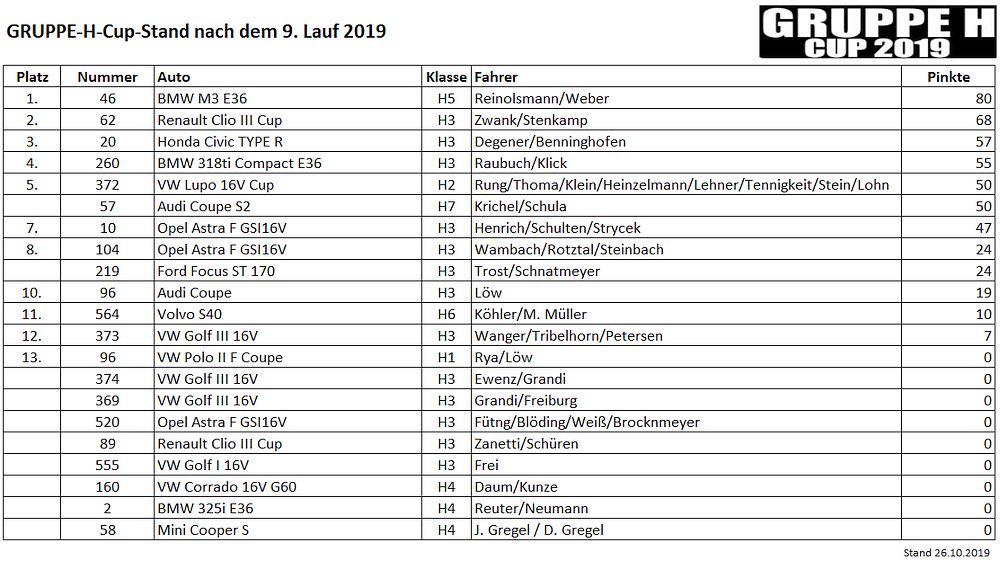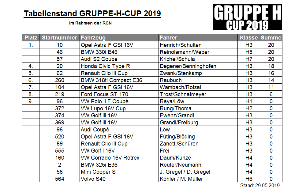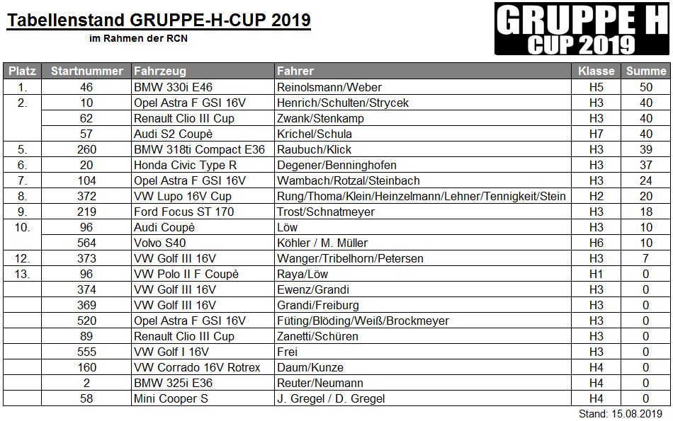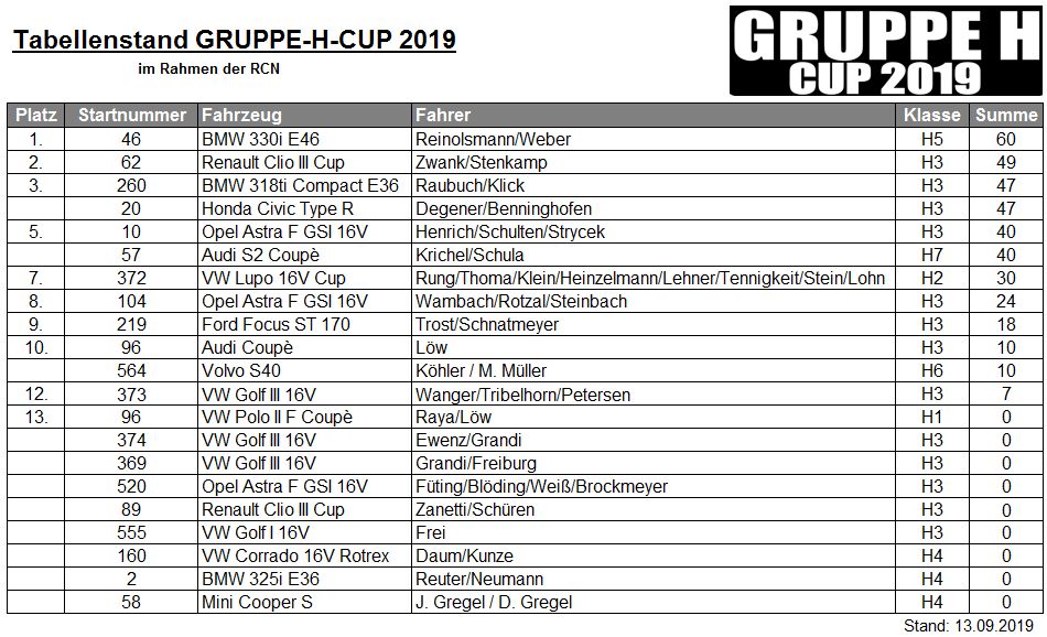 GRUPPE-H-CUP im Rahmen der RCN --- Stand nach dem achten und neunten Lauf