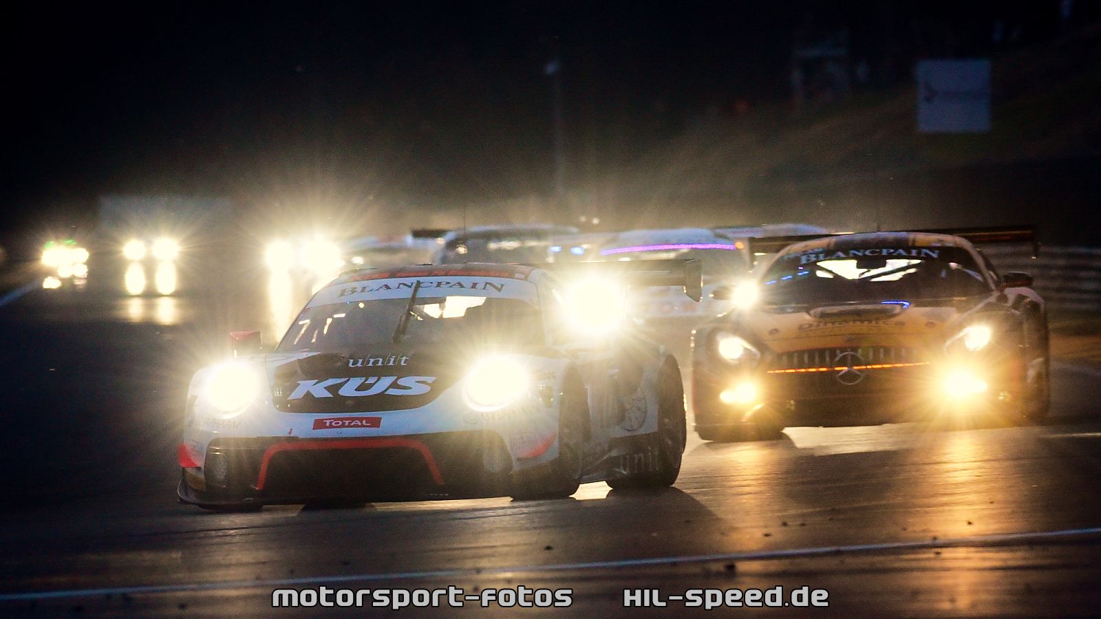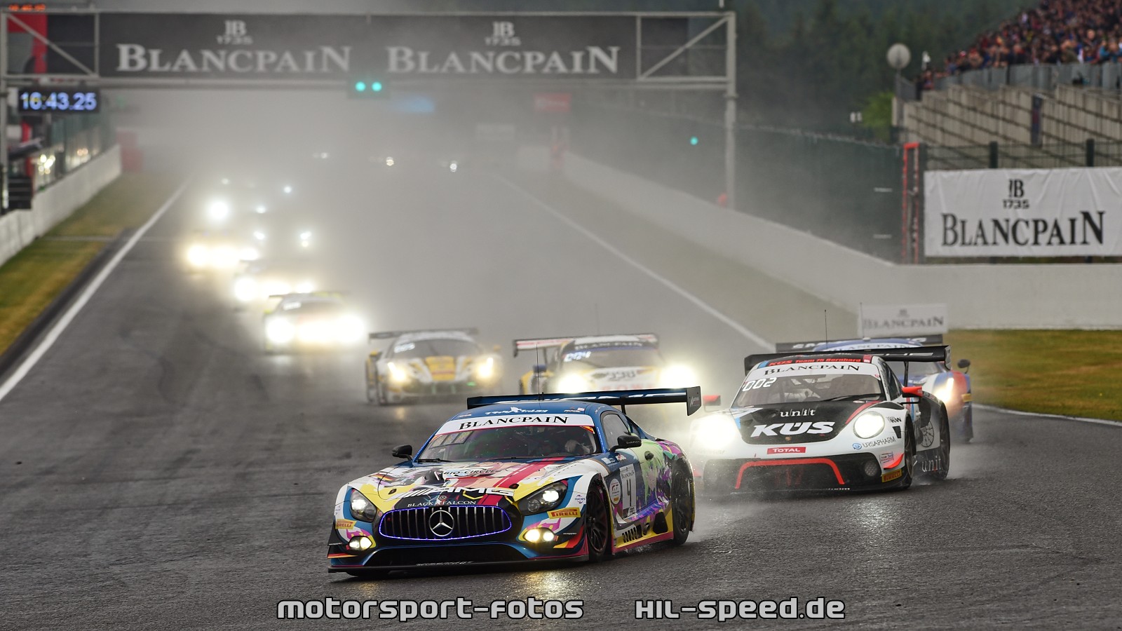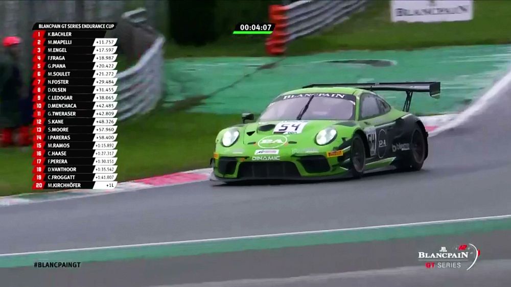 Ein starkes Gewitter mit heftigen Regenfällen veränderte die Reihenfolge an der Spitze rund zwei Stunden vor dem Rennende. Aufgrund notwendiger Tankstopps hinter dem Safety-Car, das wegen schwieriger Verhältnisse auf die Strecke geschickt worden war, fielen die beiden besten Porsche 911 GT3 R zunächst auf die Plätze drei und vier zurück. Die Rennleitung gab das Rennen jedoch 25 Minuten vor dem Ende noch einmal frei. Es folgte eine Demonstration der Stärke des GT3-Fahrzeuges aus Stuttgart auf nasser Strecke und eine eindrucksvolle Darstellung des Talents von Werksfahrer Nick Tandy. Der Brite, der das Auto mit der Startnummer 31 am Freitag auf die Pole-Position gefahren hatte, schob sich innerhalb einer Runde an die Spitze und baute seinen Vorsprung bis zur Zieldurchfahrt auf 6,746 Sekunden aus.