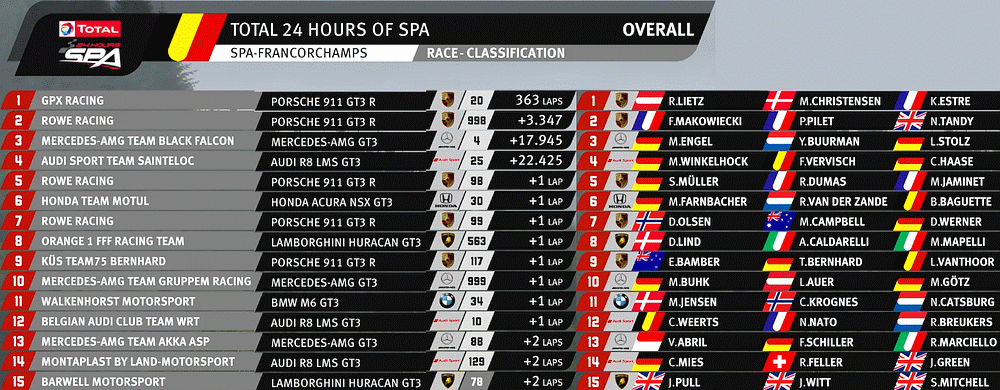 | 3. | 3. (Pro) | 20 | Porsche 911 GT3 R | GPX Racing | Michael Christensen (DNK), Kevin Estre (FRA), Richard Lietz (AUT) |