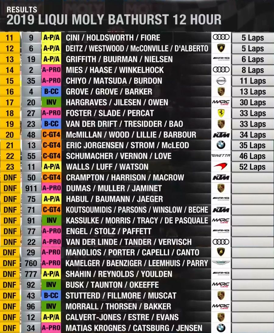 | 6 | A | Wall Racing | Lamborghini Huracan GT3 | Adrian Deitz / Julian Westwood / Cameron McConville / Tony D'Alberto |