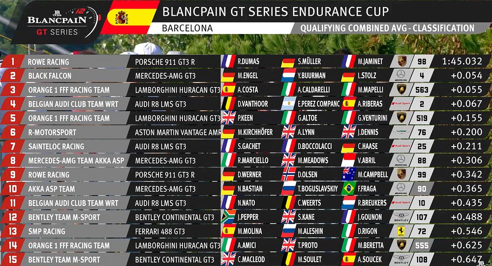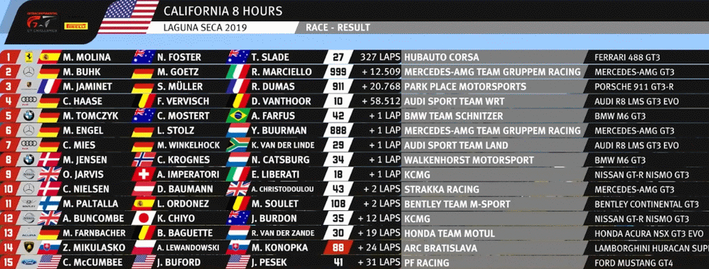 | 77 | A | Mercedes-AMG Team Craft Bamboo Black Falcon | AMG AMG GT GT3 | Maro Engel / Luca Stolz / Gary Paffett |