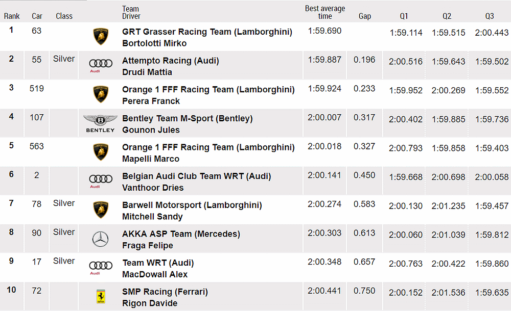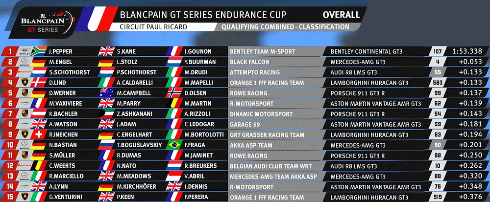 | 108 | A | Bentley Team M-Sport | Bentley Continental GT3 | Andy Soucek / Maxime Soulet / Vincent Abril |