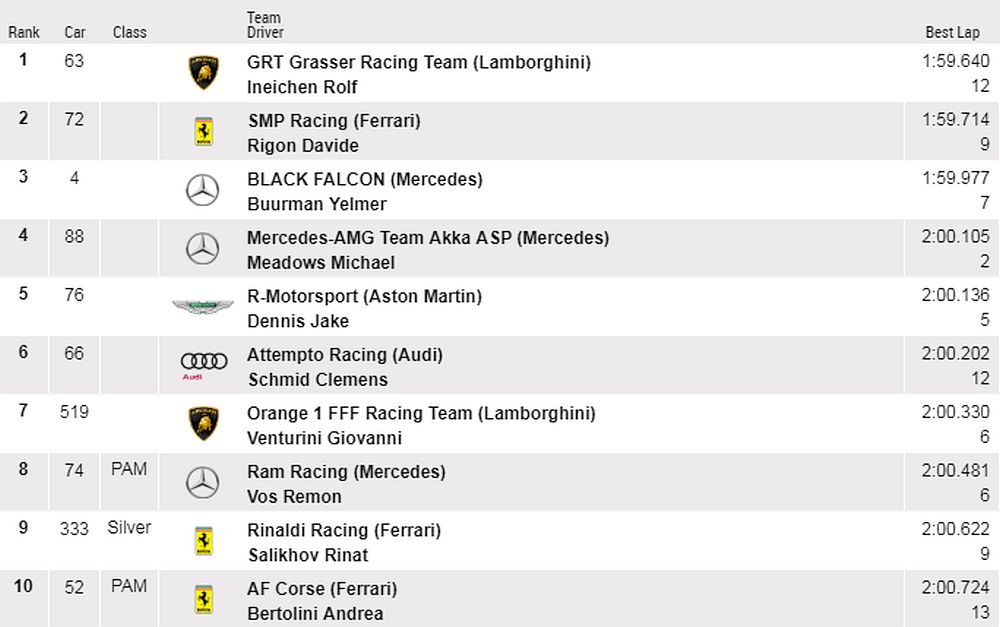 | 5. | 5. (Pro) | 10 | Mercedes-AMG GT3 | Mercedes-AMG Team SPS automotive performance | Maximilian Götz (GER), Yelmer Buurmann (NED), Luca Stolz (GER) |