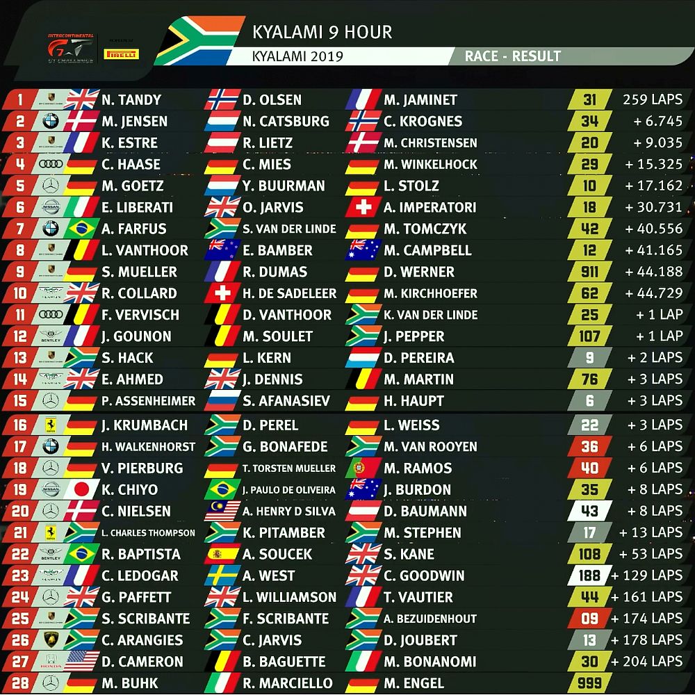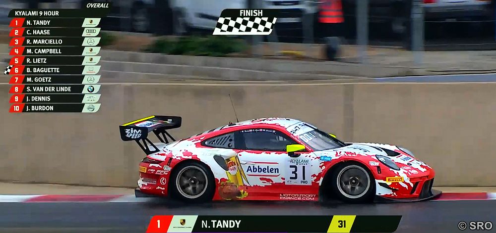 Das letzte Rennviertel wurde von monsunartigen Regenfällen bestimmt. Aus Sicherheitsgründen entschloss sich die Rennleitung daher für eine lange Safety-Car-Phase. Erst knapp 20 Minuten vor dem Ende konnte der Start wieder freigegeben werden. Schlussfahrer Nick Tandy zeigte sich im Anschluss von den schwierigen äußeren Bedingungen unbeeindruckt. Von der dritten Position aus gelang es dem Porsche-Werksfahrer in den letzten Runden den Frikadelli-Porsche 911 GT3 R an die Spitze zu bringen. Damit ist das Frikadelli Racing Team nach 37-jähriger Abstinenz der 9h Kyalami wieder der erste Sieger des südafrikanischen Langstreckenklassikers.
