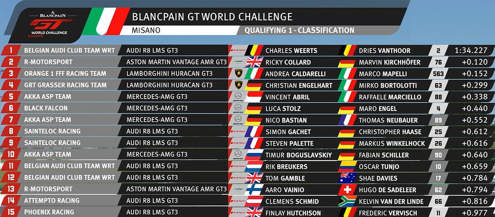 | 2 | A | Audi Sport Team Valvoline | Audi R8 LMS | Christopher Mies / Christopher Haase / Markus Winkelhock |